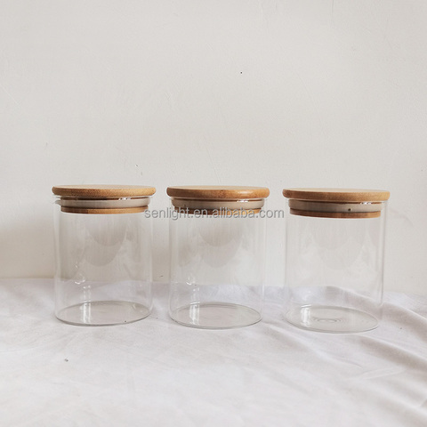 Clear Round Glass Jars with Bamboo Wooden Lids, Handmade Kitchen Glass Storage Canisters with Lids