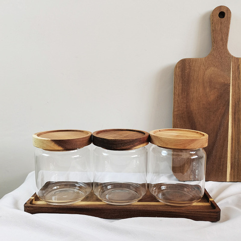 3pcs Glass Pantry Storage Jars Set Thicken Kitchen Canisters Clear Tea,Sugar,,Coffee Containers with Wood Lid and Acacia Tray